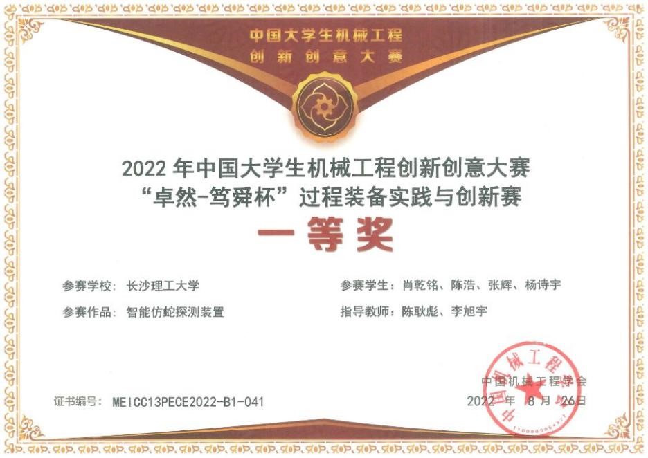 由中国机械工程学会主办,浙江工业大学等单位协办的“2022中国大学生机械工程创新创意大赛专业赛项:第十三届过程装备实践与创新赛”,经过2022年5月的校内选拔赛和2022年8月的线上全国决赛,最终产生了一等奖 、二等奖、三等奖获奖作品名单。长沙理工大学代表队取得历史性突破,共斩获全国一等奖2项,二等奖2项,三等奖4项,李旭宇、陈耿彪、高凯和吴茵四位指导老师获得优秀指导教师荣誉,获奖等级与数量创雷竞技官网在该赛项上历史新高。