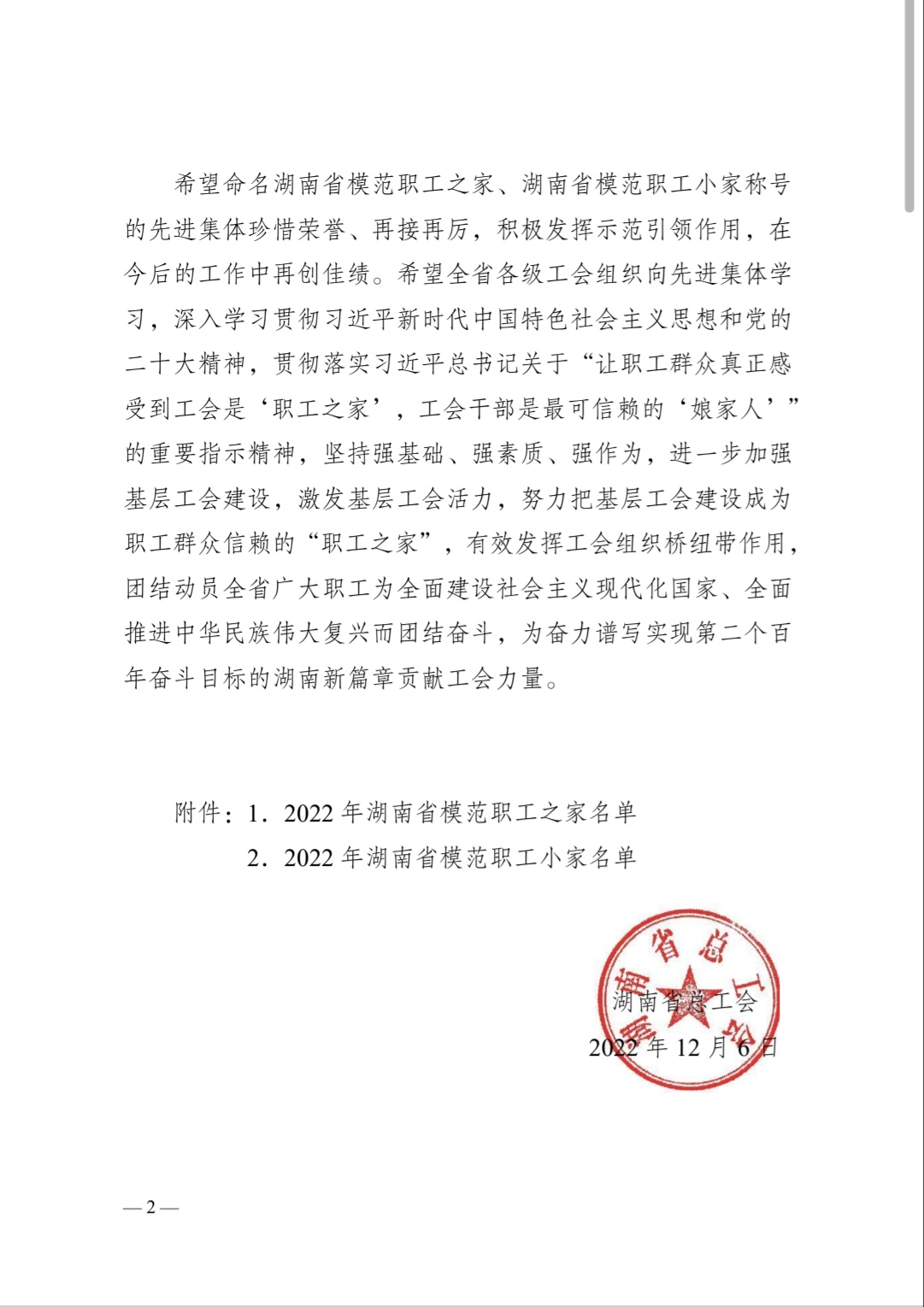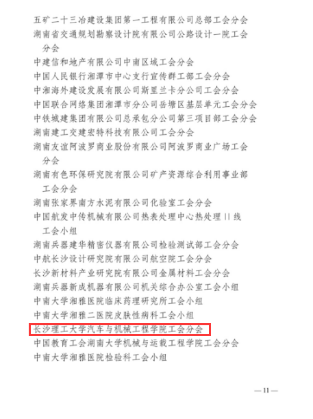近日,湖南省总工会下发了《湖南省总工会关于命名湖南省模范职工之家湖南省模范职工小家的决定》,长沙理工大学汽车与机械工程学院分工会荣获“湖南省模范职工小家”称号。