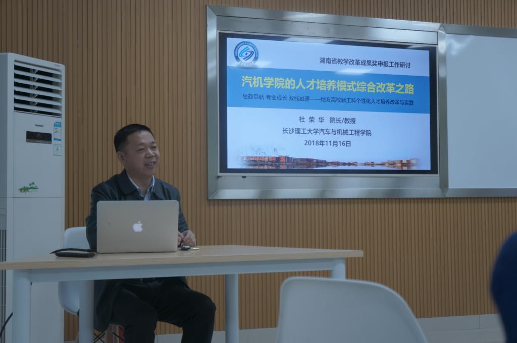 座谈会上,邱国良首先代表长沙理工大学和汽机学院对江爱华教授的到来表示衷心的感谢,并对江教授的工作经历及成果进行了简单介绍。随后江教授从“南航简况”、“教师发展的研究与实践”、“‘五航’培训计划的设计与实施”、“智慧教学的实践探索”等四个方面作了深入、精彩的报告。报告聚焦新工科人才培养,探讨在中国特色社会主义新时代和智能教育新时代下,通过梳理教师跨界发展的培养理念,构建“党政协同、产教融合、跨界发展、校际共享”的工科高校教师发展工作新体系,面向不同教师分类实施“五航”培训计划的理念和方法;介绍了南航撬动课堂革命、推动智慧教学的经验和做法,为国内工科优势高校培育具有大胸怀、大境界、大格局的一流好老师提供了理论支持和实践模型。他总结指出“教育改革的关键在于教育体制的优化和教育理念的普遍进步,在于教师自我提升的内在需求”,“智慧教学的任务是借助技术获取教育过程中的数据,依据精确的数据对问题精确定位,使评价由经验主义走向数据支持”。他呼吁广大的高校教师要更新教育理念、认真实践,尽快实现从传统教书、教学向新时代教育阶段的转变。报告在与会教师中引起强烈反响,掌声连连。