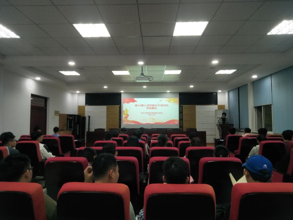 2019年10月29日晚6:30,汽车与机械工程学院第34期入党积极分子培训班开班仪式在工一B417室举行,汽机学院党委副书记靳攀科、党建辅导员王丽丽老师和本期45名入党积极分子参加本次仪式。大会由学生第四党支部副书记龙仁杰主持。