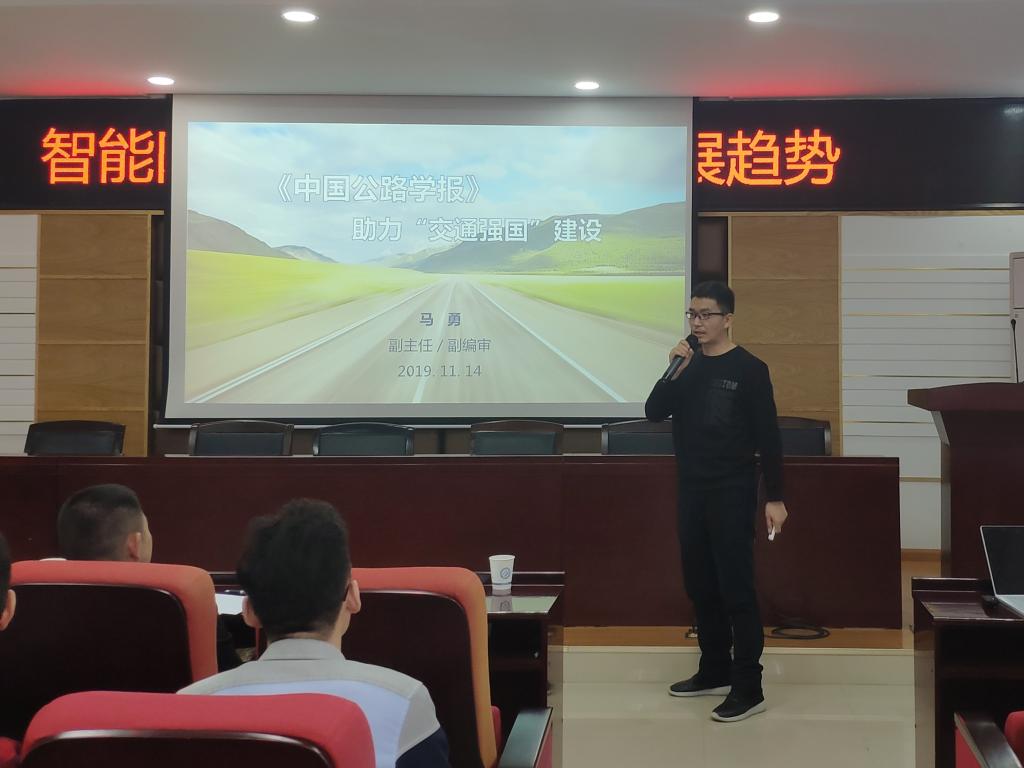 汽机学院于2019年11月14日下午4:30在工一学院学术报告厅B417举办了《中国公路学报》助力“交通强国”建设学术讲座。汽机学院副院长胡林主持本次讲座,长安大学博士、《中国公路学报》编辑部马勇副主任、张维编辑为本次讲座的主讲。汽机学院150余名教师和研究生、本科生聆听了此次讲座。