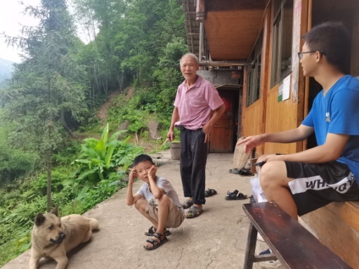 今天支教队员继续兵分林场、高田、金石三路,踏上了家访的道路。山路崎岖蜿蜒,一路向上走,印象最深刻的是一名叫刘叶波的小班男孩,他在听说我们要家访时曾对他哥哥说:“我们住这么远,老师肯定不会来我们家的。”当我们喊他的名字时,他直接从家旁的小路飞奔下来,扑到老师的怀中。在和他爷爷聊天的过程中,我们了解到他的父母在新化县上班,平常基本不回来,而这时,他用手指比了一个“六”,兴奋地告诉我们他的父母只有六天就回来了。这么小的孩子,连最简单的加减法都记不住,却清清楚楚的记得父母回来的日期,我仿佛在他的眼睛里看见了数不尽的期盼。我们告诉他,以后要努力学习,带父母住进更好的房子,他迷惑的点了点头,眼睛瞪得大大的,似乎在走神,又似乎在理解些什么。