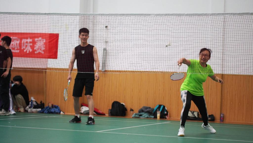 一声哨响,比赛在体育馆负一楼羽毛球场拉开帷幕。首先由主持人组织各队伍进行抽签,将12支队伍分成六组进行淘汰赛;抽完签后,各队根据对手人员进行排兵布阵,安排队员出场顺序。第一轮比赛赛制为“四场单打+三场双打”,经历激烈的比赛之后,几支队伍在排兵布阵上取得了良好成效,均以全胜晋级第二轮,其中王方、王向红老师也在赛场上展露雄姿,高远球、扣杀和吊球信手拈来,以高超的水准技惊全场。第二轮比赛采取第一轮积分排名第一和最后一名对打,以此类推,进行6进3的晋级赛。经历过第一轮的热身赛后,第二轮队伍的参赛选手皆斗志昂扬,第二轮赛制是“三场单打+两场双打”,随着比赛场次减少,竞争愈演愈烈,经过6支强队的激烈比拼后,3支队伍成功晋级决赛,进行最后的奖牌争夺战。