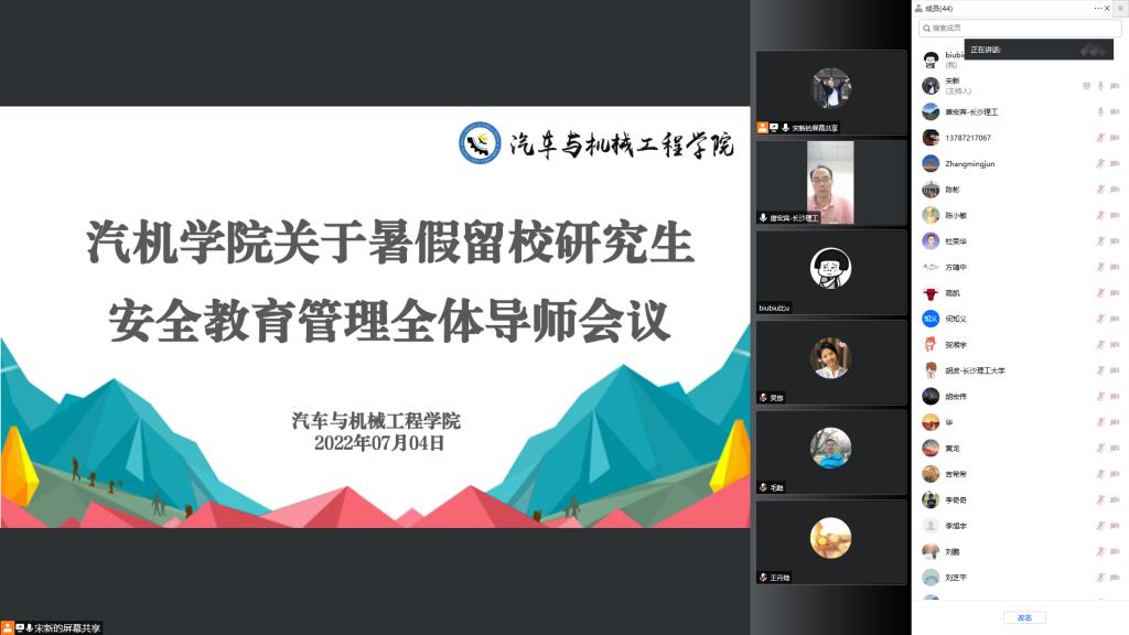 为进一步加强留校研究生安全教育,落实学校对暑期留校学生的安全工作要求,提升导师责任意识,学院于7月4日召开了研究生导师线上会议。学院党委副书记唐宏宾、暑期内有研究生留校的全体研究生导师参加了会议,会议由学院研究生辅导员宋新主持。