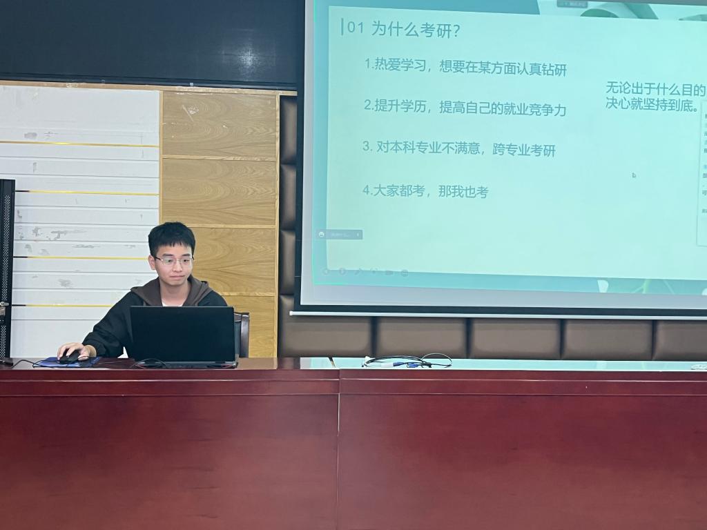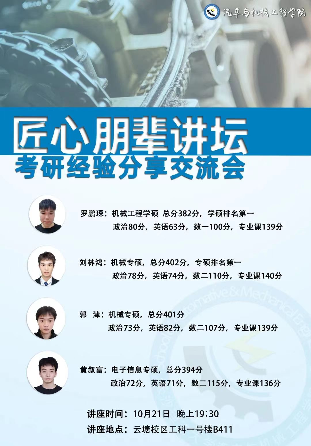 2022年10月21日晚上七点三十分,汽机学院在云塘校区工科一号楼B417举办2022年考研经验交流分享会。旨在进一步帮助同学们明确考研方向,熟悉备考流程,提升备考能力。本次交流分享会邀请到了汽机学院2022级研究生郭津、刘林鸿、黄叙富和罗鹏琛为同学们分享考研心得,包括各科的复习方法,考研信心的树立,时间安排以及专业课的复习重点。本次分享会由研究生罗小磊主持,分享会吸引了众多本科生前来聆听。