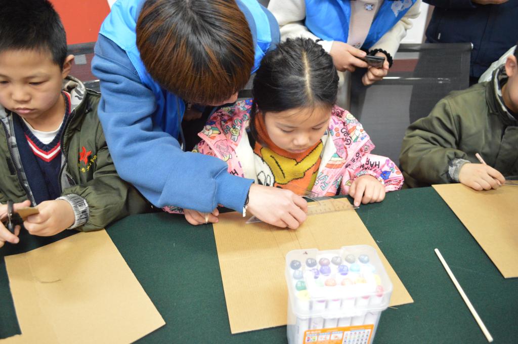 趣玩会的志愿者带着小朋友两两一组一起合作,用硬纸板制作出一只只竹蜻蜓,并用画笔装饰着自己亲手制作的竹蜻蜓。随着小朋友们相继制作完成,教室里充满了欢声笑语!小朋友们兴致勃勃地向大家展示了自己制作的竹蜻蜓,比谁的竹蜻蜓飞得更高。最后志愿者们还给每一位小朋友赠送了带来的小礼物。