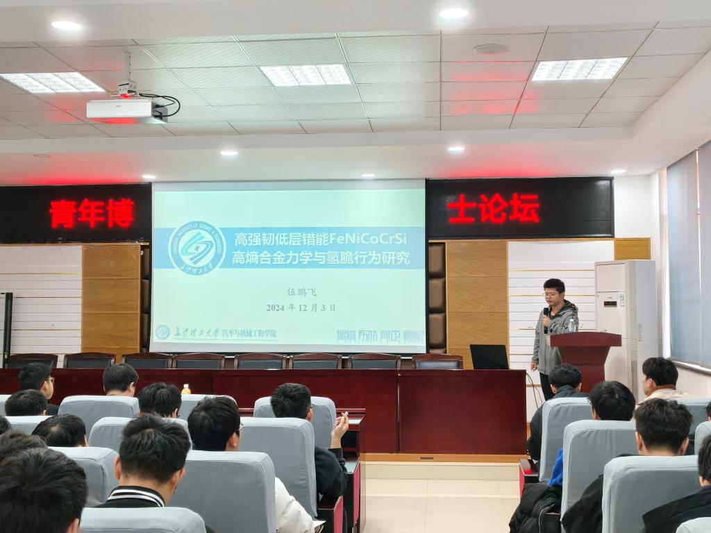 2024年12月3日下午,长沙理工大学汽车与机械工程学院在工科一号楼B区417多功能报告厅举办了一场题为“高强韧低层错能FeNiCoCrSi高熵合金氢脆行为研究”的学术报告。本次讲坛由长沙理工大学讲师伍鹏飞博士主讲,旨在深入探讨高熵合金在氢环境下的脆化行为及其对材料性能的影响。