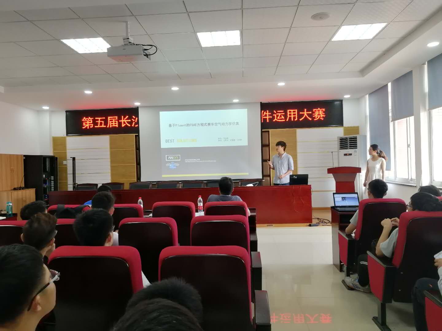 经初赛选拔后,八支参赛队伍晋级决赛。决赛首先由每个参赛队伍派出一位成员通过PPT及视频的方式向评委组及现场观众讲解小组参赛作品的工作原理和仿真过程。然后两位评委老师结合作品项目说明书,对参赛选手进行提问,同时特别对每一个项目仿真结果能否运用到实际中与参赛队伍进行了讨论。最后经评委组严谨地分析和讨论,在对参赛队伍项目进行打分后,“基于耐撞性拓扑优化的防撞垫吸能盒稳健性设计”项目获得一等奖,“基于Fluent的FSAE方程式赛车空气动力学仿真”、“FASE赛车进排气系统的UG建模及CFD优化分析”项目并列获得二等奖。