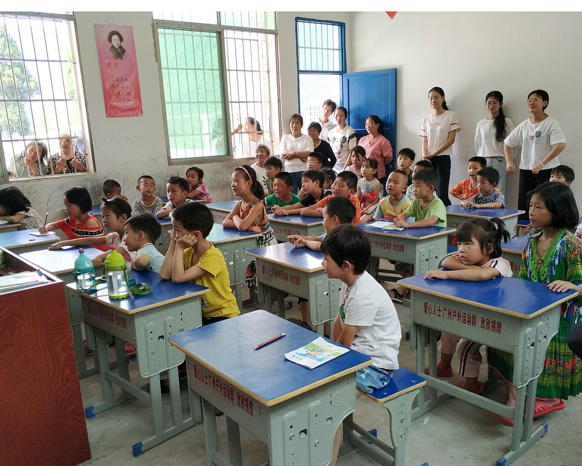 23日早上八点,报木村小学的大铁门“咯吱”一声,这里迎来了第一个小男孩。他背着大大的书包,紧紧牵着爸爸的手,睁大眼睛望向新老师们。等候在教学楼前负责签到的老师们打着招呼并悉心指引:“你好,小朋友,过来这边写下你的名字。”小男孩一笔一划、歪歪扭扭、却无比认真地写下他的名字——邓新慧。随后,小朋友们跟着家长陆续到来,共有41位签到报名。支教队队员们将小朋友们自幼儿园至三年级划分为小班,四年级以上划为大班。