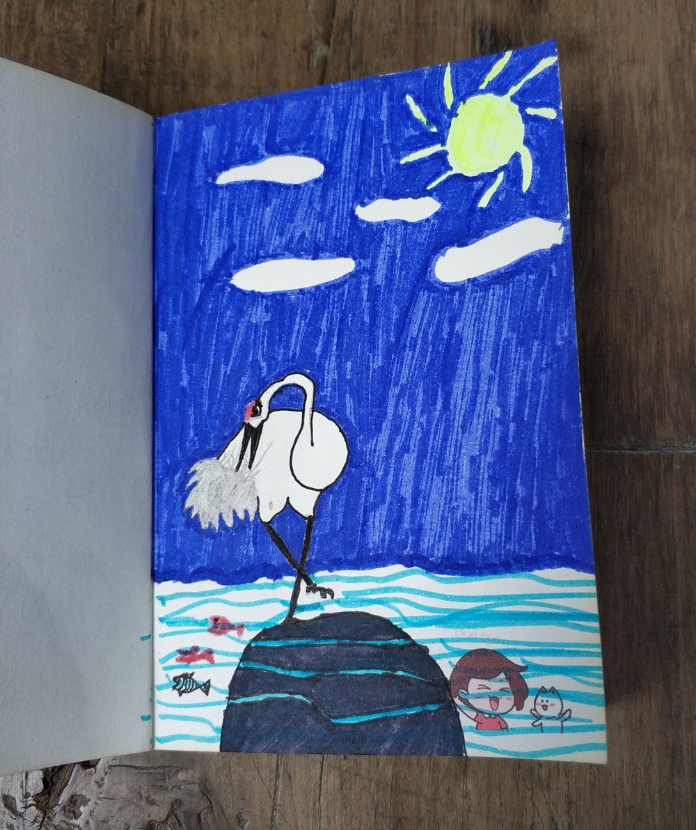 午餐休息时间,有一个小男孩拿着他自己的小画本给美术老师看。有白鹤茕茕独立,有诗仙李白拾书而立。“个人而言,我最喜欢你的第一幅画,色彩搭配很协调舒服。当然每一幅画都很棒,继续加油。”美术老师开心的跟小男孩交流,“或许你以后可以开始试着注意画阴影部分,让画立体起来。”对于老师来说,最开心的便是能帮助孩子们进步成长。