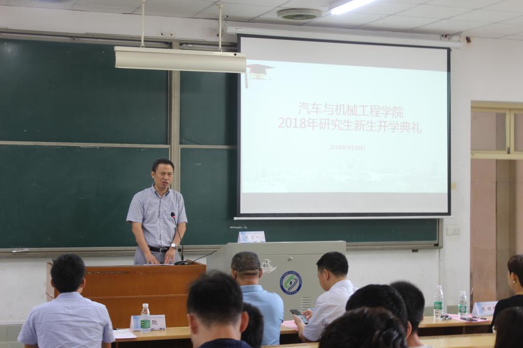 会议伊始,在毛聪副院长对与会学院领导老师进行简要介绍、对全体2018级研究生新生表示欢迎后,杜荣华院长发表讲话。杜院长首先代表全院领导热烈欢迎18级硕士新生加入汽车与机械工程学院这个大家庭。他告诫同学们,在人生美好的年龄,要时刻牢记“安身立命,以梦为马”,努力钻研,不畏艰难,成为 “修业、敬业、乐业、精业”的汽机人。随后,蒋仁言教授以河北工业大学的开学典礼和奥巴马讲话为例,指出,同学们不应只注重结果,应活在当下,享受过程,不问结果,同时不能将读书视为苦差事,在有理想有目的的同时也不可将读书庸俗化。接着,高年级研究生代表周登辉也号召同学们面对科研、对生活要充满热情,少一点功利之心,多一点精神追求。最后,在周登辉的带领下,全体研究生新生庄严宣誓。