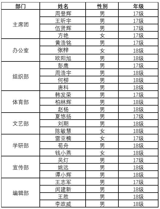 经过个人申请,组织审核和面试表现,经过研究生会主席团及各部门部长讨论,将张梓等16名同学纳为汽机学院第十三届研究生会新成员。现将汽机学院第十三届研究生会拟任名单公示如下: