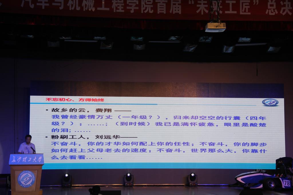大家下午好,祝贺你们今天上午在暴雨中完美地完成了长沙理工大学第一堂考试的答卷,人生不历经风雨,又怎能见彩虹。长理不是211,更不是985,也不是双一流建设高校,但她却是最受五百强企业喜爱的二十所高校之一,在这里,你们总有听不完的“长理人如何成为大国工匠”的故事,你每年都能看到F1方程式赛车队上演的“速度与激情”连续剧,也能遇见2018年全国10个最美教师之一的蓝茵茵。刚刚上台展示的“未来工匠”们,蒋逸、郑汉、姜玉婷、彭发明、齐帅宾等,他们一一诉说了自己不一样的精彩故事,我相信你们只要秉持汽机人“修业、敬业、乐业、精业”的匠心品质,他们昨天的故事就是你们明天的故事,你们的故事就是汽机的故事,就是长理的故事。因此,我愿陪伴你们“追求卓越,做更好的汽机人”。