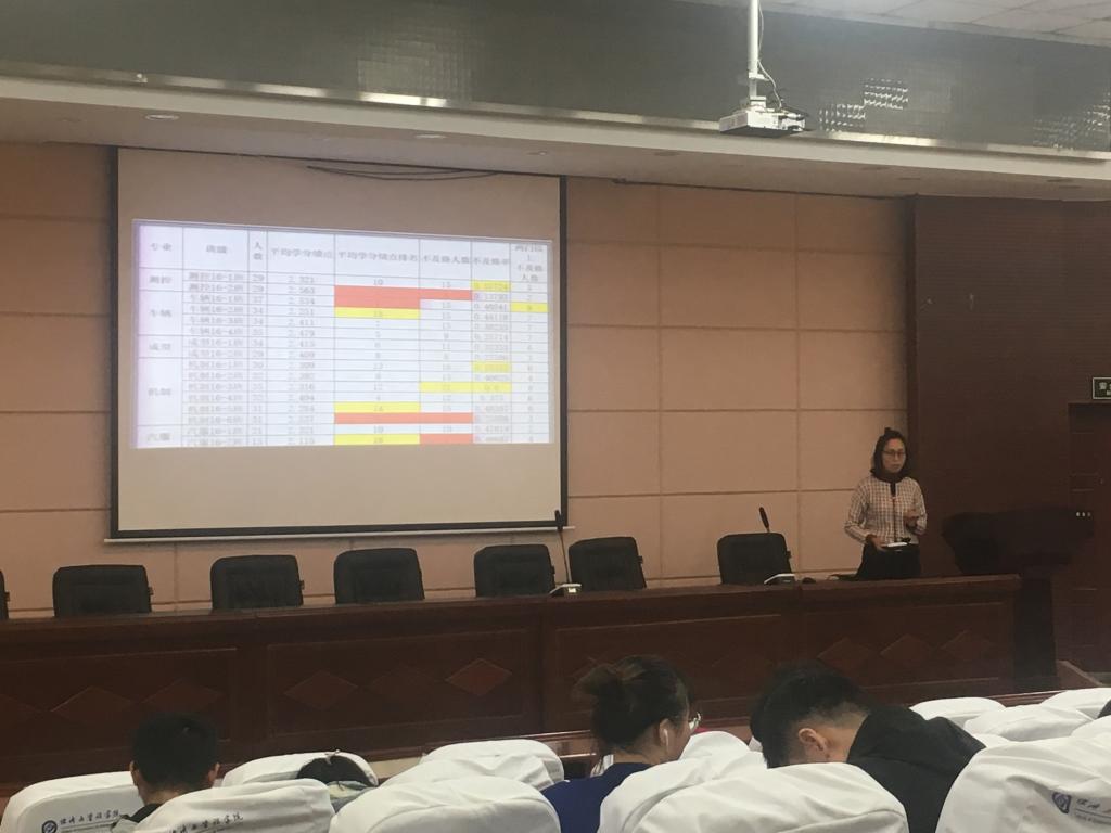 本次大会为期末考试及考研准备工作拉开了帷幕。大会首先由2016级辅导员周老师进行上学期成绩分析。周老师从学期纵向对比、专业班级横向对比等多个角度分析了各班级的学业成绩基本情况,肯定了进步明显的班级和个人,敦促有所退步的班级迎头赶上。会上,她分析了几起考试违纪违规的案例提醒同学们期末考试来临,严格遵守考试纪律,严肃考风考纪;针对出现学籍处理的情况,她希望所有同学励志学习,主动帮助学业落后的同学,不让任何一位同学掉队。