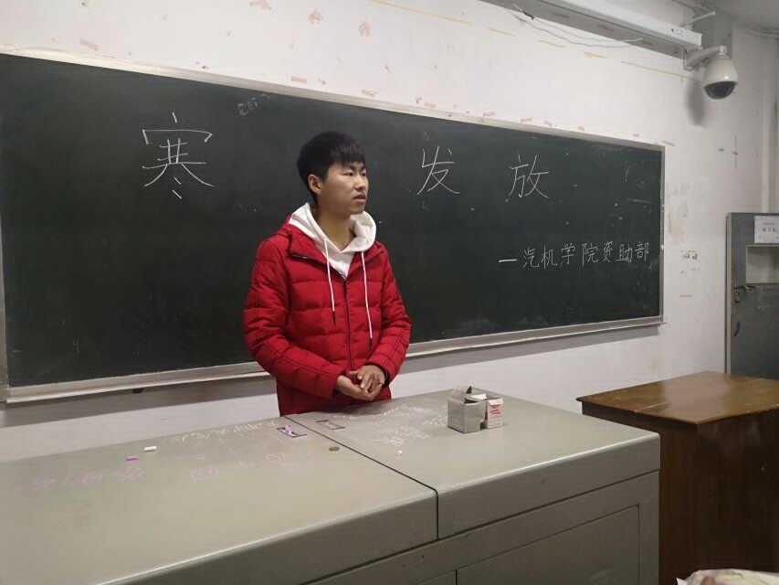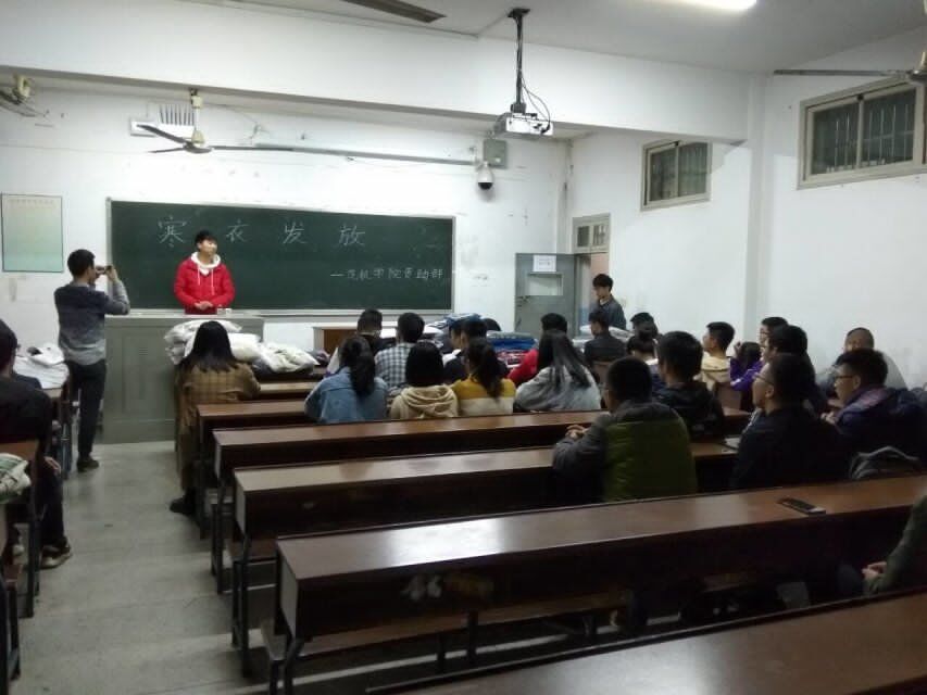 2018年11月28日晚上六点半,汽机学院资助部在金盆岭校区12教314开展2018级家困生寒衣发放工作,18级辅导员路平安老师、院学生会资助部成员们以及18级家困生参与了这次活动。