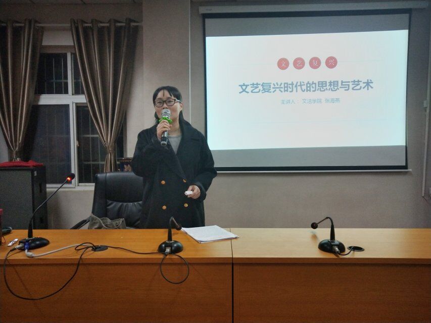2018年12月13日晚。汽机学院于2号教学楼201举办匠心学堂"通识讲坛",特邀文法学院张海燕教授作《文艺复兴时期的思想与艺术》主题讲座。共计100余名同学参加本次讲坛。
