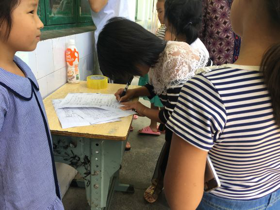 七月十四日早,听说勤奋的人都起得早。勤奋是有传染力的,所以某些懒惰的人也起得早。一阵洗漱声过后,招生开始啦。我们的招生分为一二三、四五六、七八九三个年级段。短短一上午,我们招收了苗村大大小小五十四名同学。在村里走的路上,小孩子从我们身边路过说了“老师好”三个字,一行十二人身上瞬间多了一份实实在在的责任。虽然今天没有任何教学任务,但是对于未来十四天的支教生活我们有了清晰的计划。