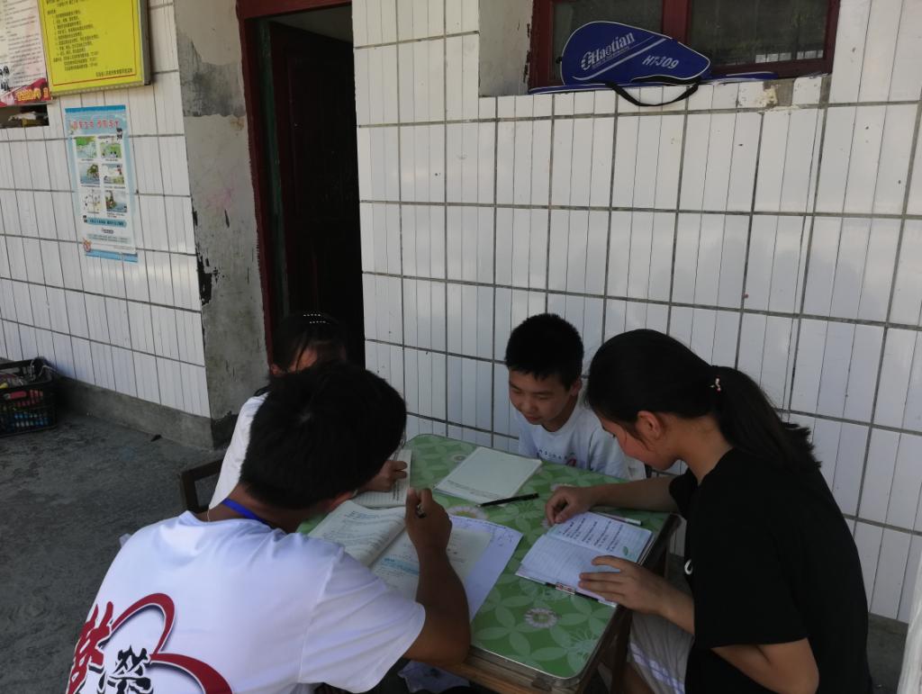 上午9:00,大班门口,一方桌、四板凳、三学生和一位老师组成了一支辅导团队。这三位学生都处在初二即将升初三的关头。考虑到他们的特殊处境,支教老师决定在大班上数学课的时候找有空的老师专门辅导他们。他们已褪去开始的羞涩,与老师谈笑风生。学生有疑必问,老师知无不言,一派和谐景象。