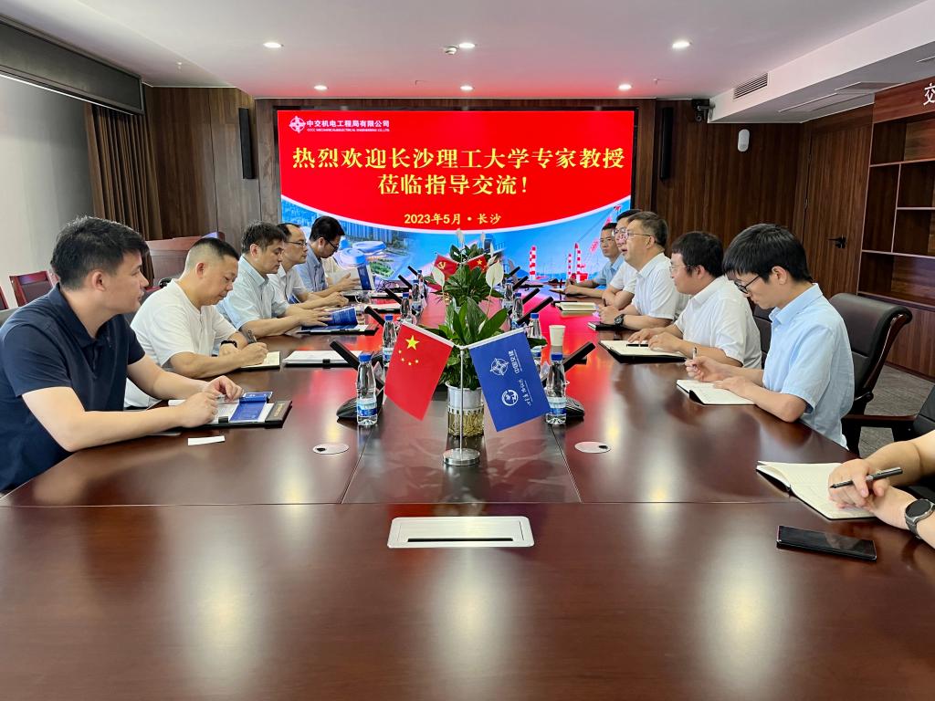 中交机电工程局有限公司第五工程分公司副总经理、总工程师殷展庆对长沙理工大学汽机学院施一满书记一行表示欢迎,他从五公司的发展历程、业务情况、技术创新等内容进行了交流,殷总表示:五公司2021年刚在长沙落户,尚在起步阶段,不管是人才培养、科学研究,还是技术创新,都需要跟本土高校加强合作与交流。