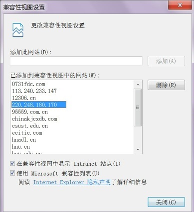 请您按照图2所示,在IE选项中选择“兼容性视图设置”栏目,将本网站网址“220.248.180.170”添加至兼容网站列表中,问题将得到解决。