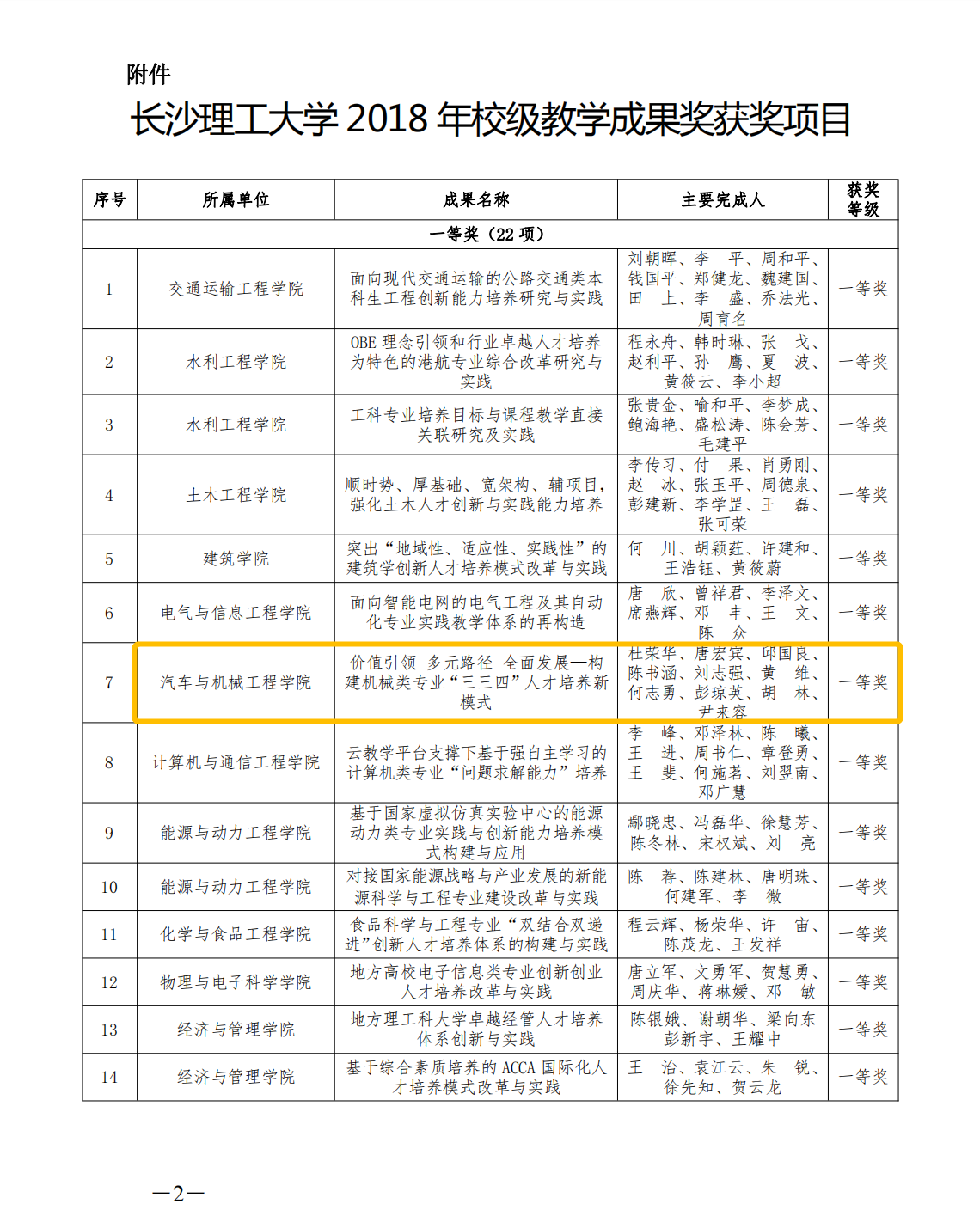 根据湖南省教育厅《关于开展第十二届湖南省高等教育教学成果奖励工作的通知》(湘教通〔2018〕553号)和教务处《关于做好2018 年校级教学成果奖申报工作的通知》精神,经学院推荐,学校组织专家评审,且公示无异议。“面向现代交通运输的公路交通类本科生工程创新能力培养研究与实践”等56项教学成果获评2018 年教学成果奖,其中一等奖22项,二等奖19 , 三等奖15项。