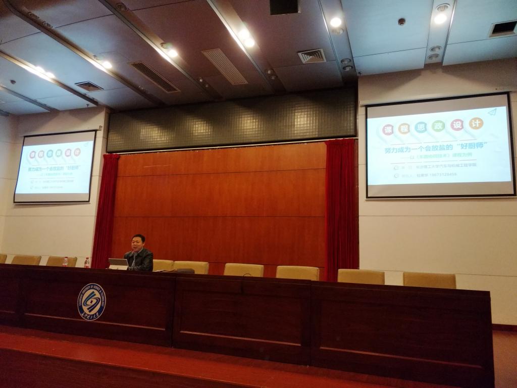 为深入贯彻落实全国高校思想政治工作会议和全国教育大会精神,11月27日,汽机学院编制了《长沙理工大学汽车与机械工程学院“课程思政”教学设计编制指南》,并向全体教师作了“课程思政”示范课程立项建设动员。12月18日下午,汽机学院再次在云塘校区图书馆报告厅召开全体教职工大会,院长杜荣华就“课程思政”建设作《努力成为一个会放盐的“好厨师”》的专题报告,全院教职工、50名学生参加了会议,会议由副院长何志勇主持。