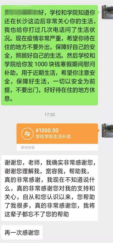 土木学院辅导员在跟学生联系的过程中,了解到学院有4名少数民族学生和1名延长学制学生因家庭经济困难既没有在校也没有回家,而是在外兼职打工,辅导员綦丽、董治佑、李小军马上要求学生就地做好防护,并代表学院给每人转账1000元,确保他们生活有保障。