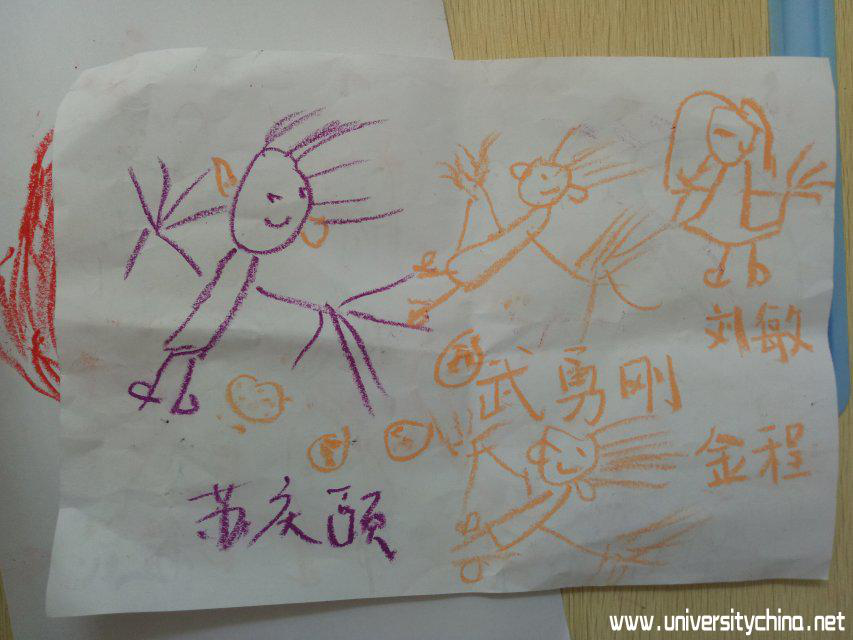 孩子们在白纸上用彩色蜡笔,画了每个老师,又扯着老师的衣袖说:“老师,你看,我画了你的样子,你写你的名字好不好?”
