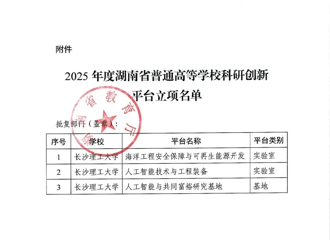 近日,湖南省教育厅正式公布了2025年度湖南省普通高等学校科研创新平台立项名单。由长沙理工大学人工智能学院学术副院长万琴教授作为负责人牵头申报的“人工智能技术与工程装备”湖南省普通高等学校重点实验室成功获批立项。