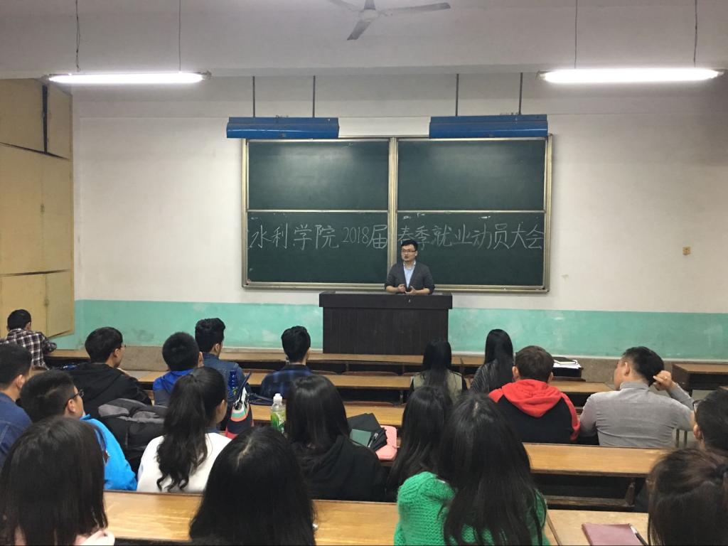 3月30日晚,水利工程学院在金盆岭校区3教115室举行2018届春季就业动员大会,会议由学院党委副书记王学成主持,学院就业专干贺志琼到场与会,2018届全体未就业研究生、本科生参加本次会议。
