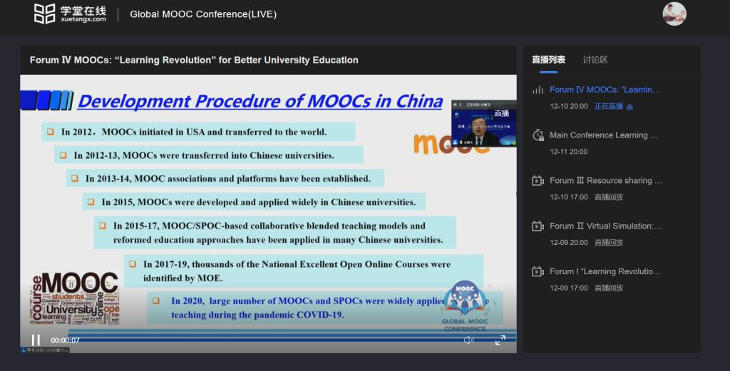教育部部长陈宝生在报告中分享了中国慕课与在线教育的实践、创新与探索。陈宝生表示,2020年,为应对疫情危机,中国政府作出了“停课不停教、停课不停学”的决定,和全国师生一起开展了一场史无前例的大规模在线教育实践,成功应对了疫情危机,基本实现了在线教学与课堂教学的实质等效。进入后疫情时代,中国教育已进入高质量发展新阶段,发挥慕课与在线教育优势,有利于构建方式更加灵活、资源更加丰富、学习更加便捷的全民终身学习体系,实现人人皆学、处处能学、时时可学。陈宝生倡议,应秉承合作共赢,开放包容的理念,共同推进慕课与在线教育的建设、发展和共享。