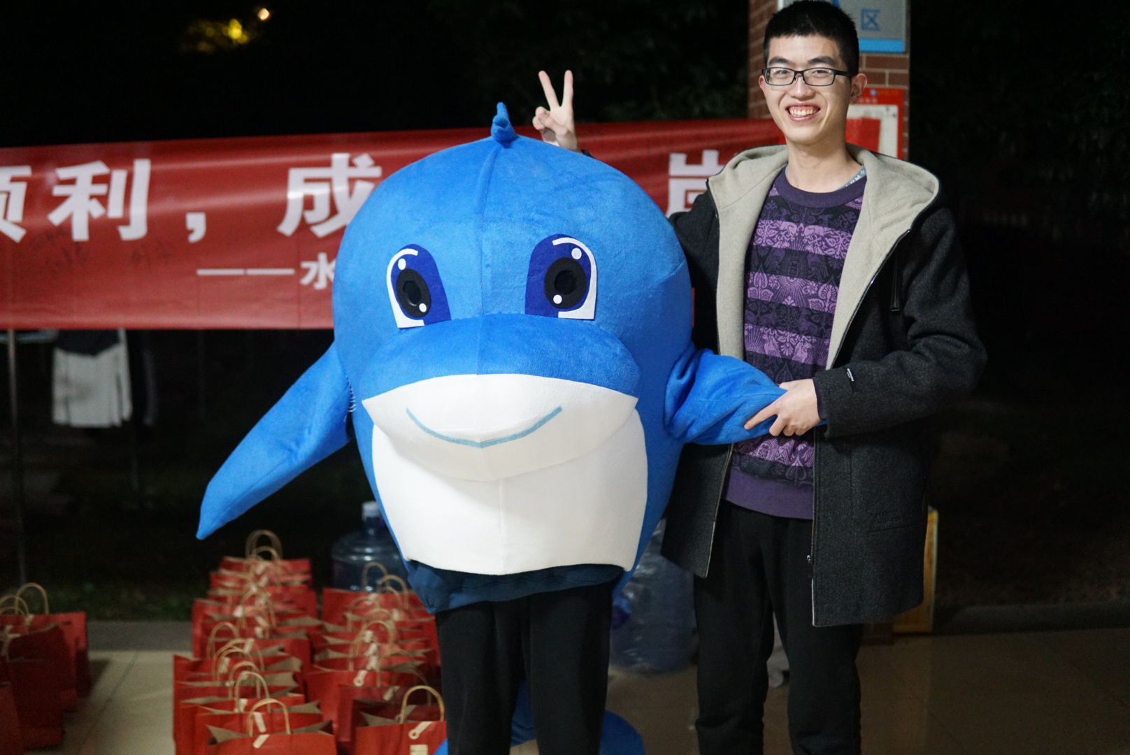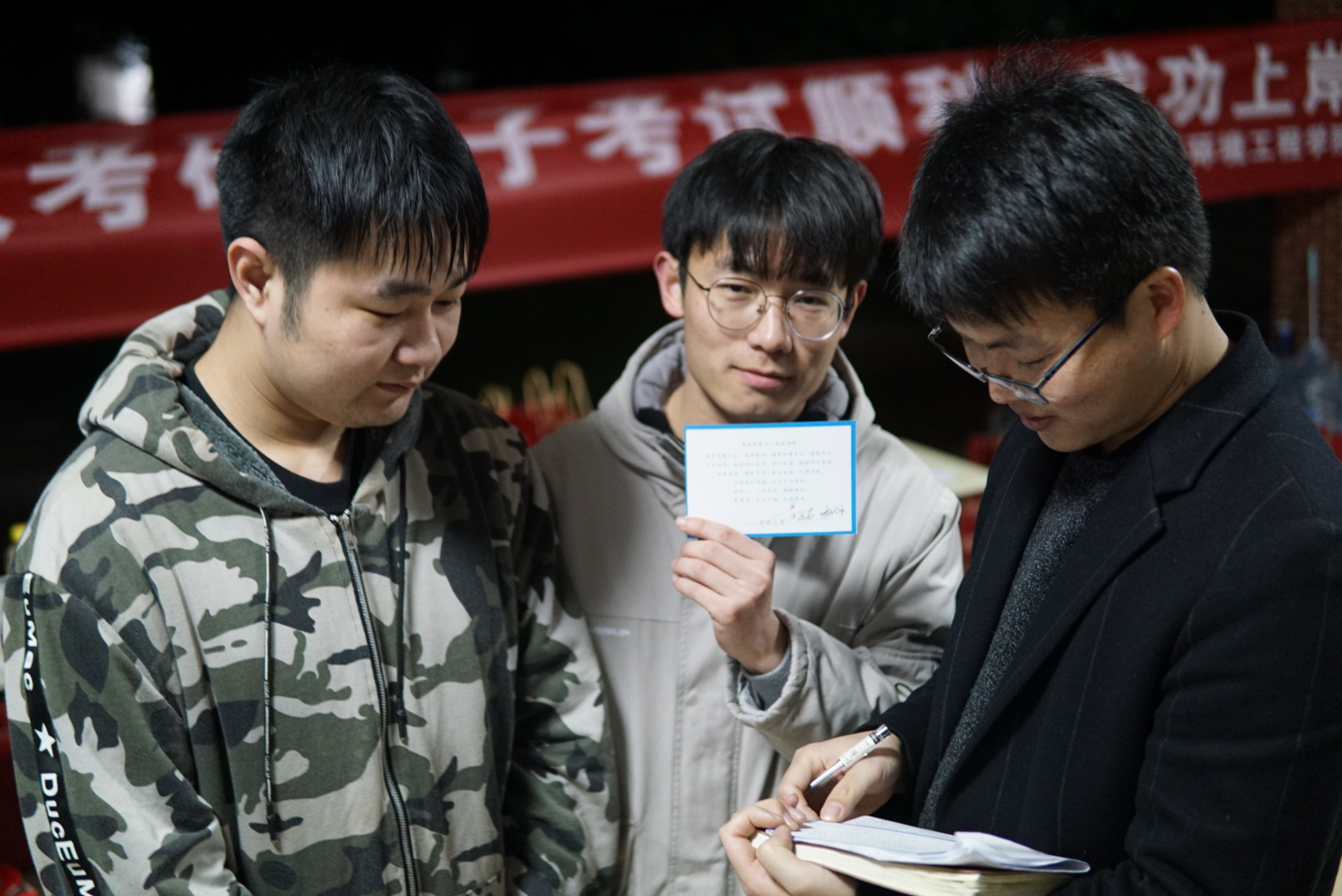 活动还包括写祝福明信片、与海豚玩偶拥抱解压、在横幅上签名留言等。毕业生辅导员黄远发老师亲手为考研学子写下了《寄水利学子一战成硕赋》,“任重载盛之志,成学转识……水利人,一战成硕,旌旗相照……”一段饱含深情的文字从笔尖流出,横幅和明信片上的“星光不负追梦人,愿所有考研人旗开得胜,一战成硕!”、“坚持到底,胜利一定是属于你们的”等爱心寄语充满同学们对考研学子的祝福,字字触动人心。