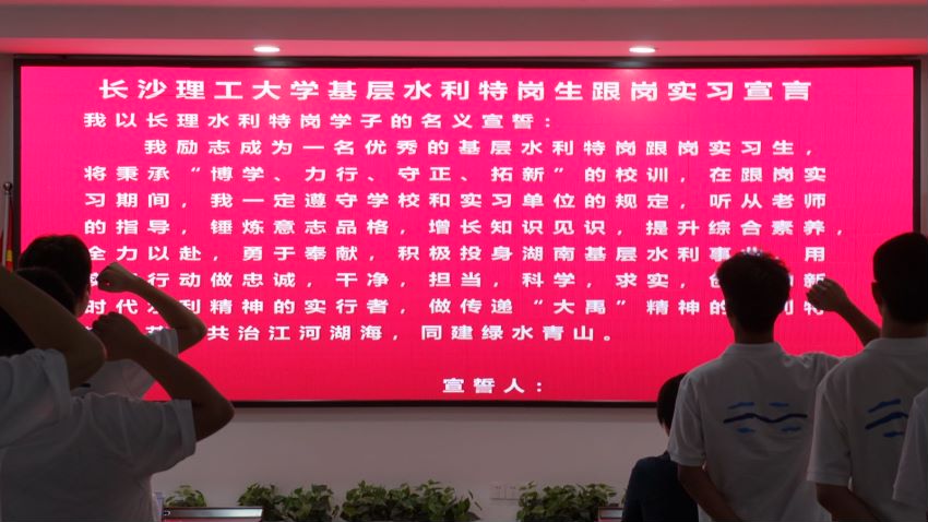湖南省水利厅人事处郑东科长授出征旗,出征授旗仪式的举行标志着跟岗实习的号角正式吹响。彭承长同学带领全体水利特岗生宣誓,洪亮的声音、饱满的热情、坚定的眼神,表达了水利特岗生们圆满完成跟岗实习的决心。