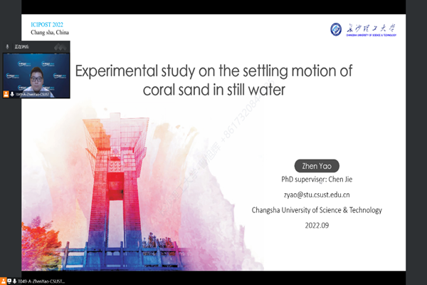会议期间,我院研究生积极参与线上会议,学习到多种新技术在处理海洋科学问题中的应用,并就自己的研究工作与科研问题等同与会专家学者线上进行交流探讨,收益颇多。其中,我院姚震博士研究生做了题为“Experimental study on the settling motion of coral sand in still water”的学术报告。