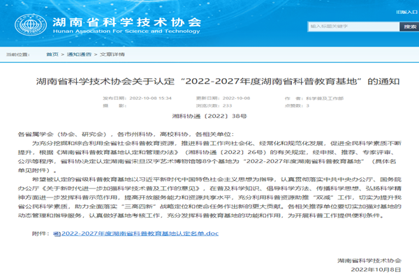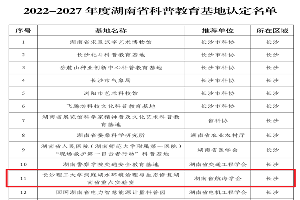 为充分挖掘和综合利用全省社会科普教育资源,推进科普工作向社会化、经常化和规范化发展,促进全民科学素质不断提升,根据《湖南省科普教育基地认定和管理办法》(湘科协通〔2022〕26号)的有关规定,经申报、推荐、专家评审、公示等程序,省科协决定认定湖南省宋旦汉字艺术博物馆等89个基地为“2022-2027年度湖南省科普教育基地”。经水利学院申报、湖南省航海学会推荐,洞庭湖水环境治理与生态修复湖南省重点实验室成功被认定。
