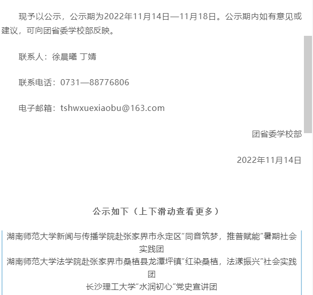 在湖南省大中专学生志愿者暑期文化科技卫生“三下乡”社会实践活动总结中,长沙理工大学“水润初心”党史宣讲团获省优秀服务团队,杜丘获优秀指导者。