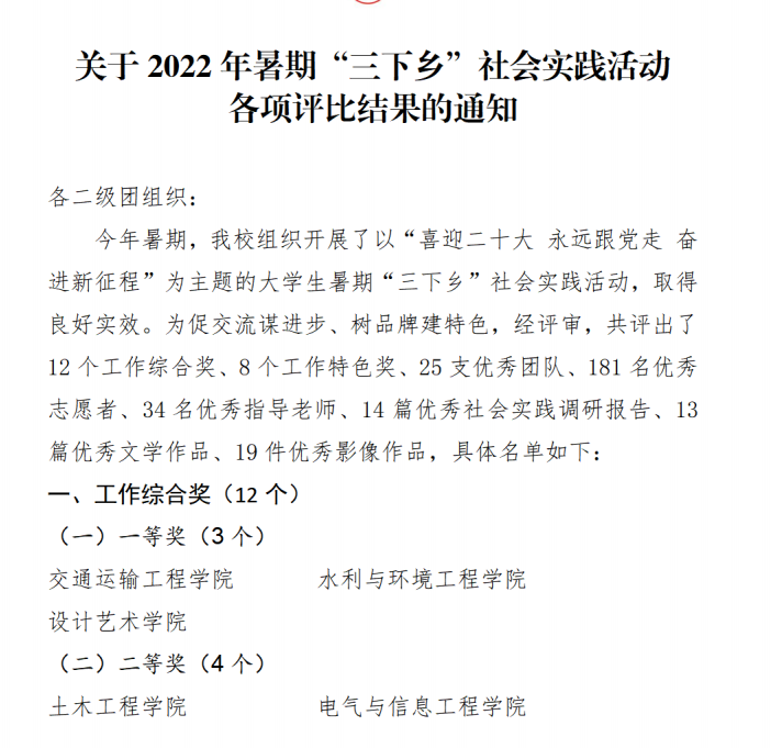 近日,2022年湖南省大中专学生志愿者暑期文化科技卫生“三下乡”社会实践活动总结结果和长沙理工大学2022年暑期“三下乡”社会实践活动评比获奖名单公布,水利与环境工程学院在各项评比中喜获佳绩。