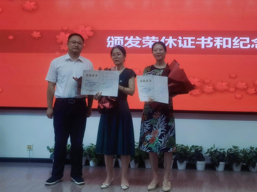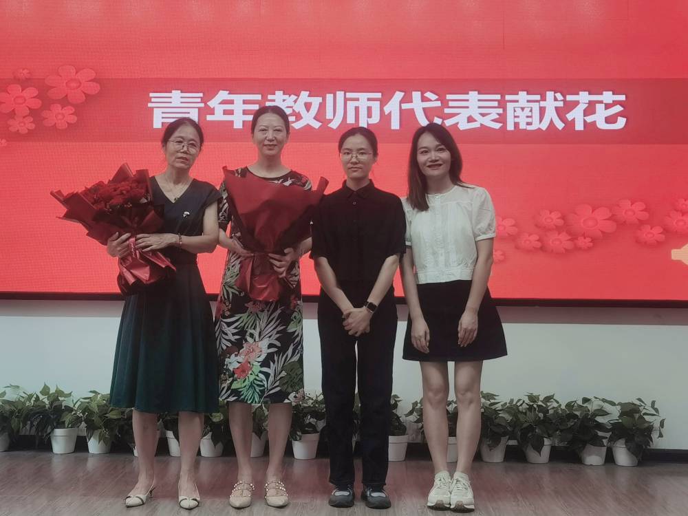 新入职青年教师代表为荣休教师敬献了鲜花,陈院长为荣休教师赠送了纪念品并合影留念。