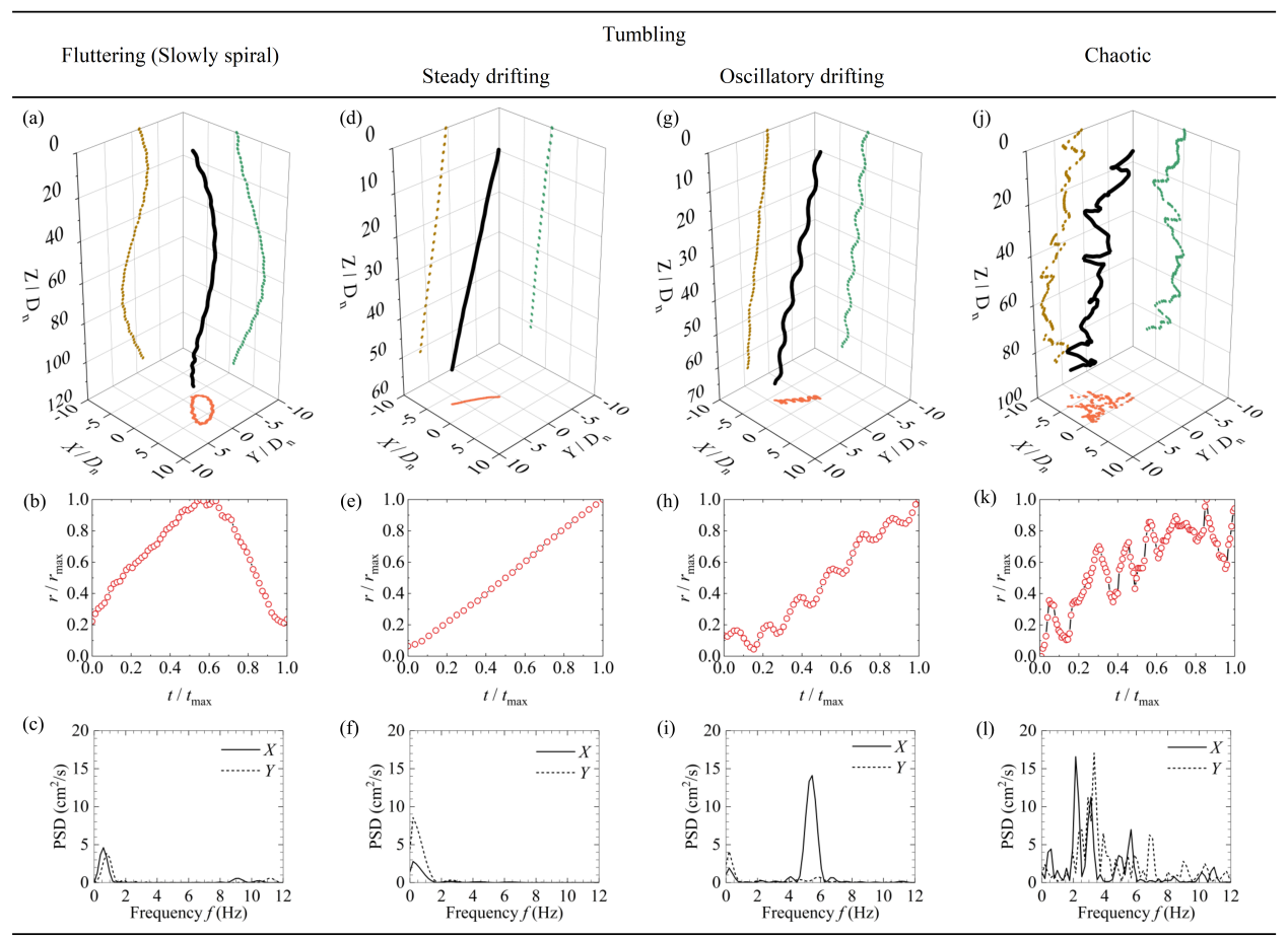 针对以上问题,蒋昌波研究团队对珊瑚砂颗粒沉降运动开展实验研究,通过图像追踪技术,重构了珊瑚砂颗粒的三维沉降轨迹,并基于频谱分析划分了三种不同的沉降轨迹类型,并统计了出现三种沉降轨迹的概率。结果表明,如果随机挑选一颗珊瑚砂颗粒,那么这三种沉降运动模式(翻滚运动(Tumbling)、混沌运动(Chaotic)、摆动运动(Fluttering))发生的概率分别约为26%、42%和32%。