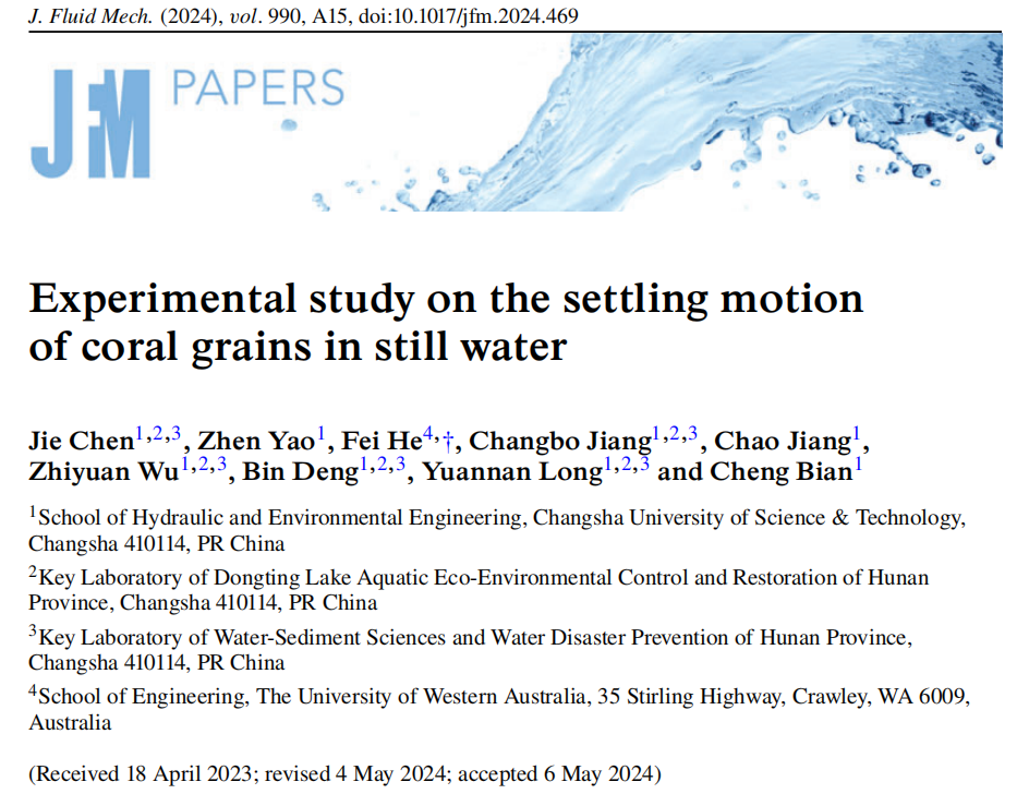 论文引用格式:Chen J, Yao Z, He F, et al. Experimental study on the settling motion of coral grains in still water. Journal of Fluid Mechanics. 2024;990:A15. doi:10.1017/jfm.2024.469