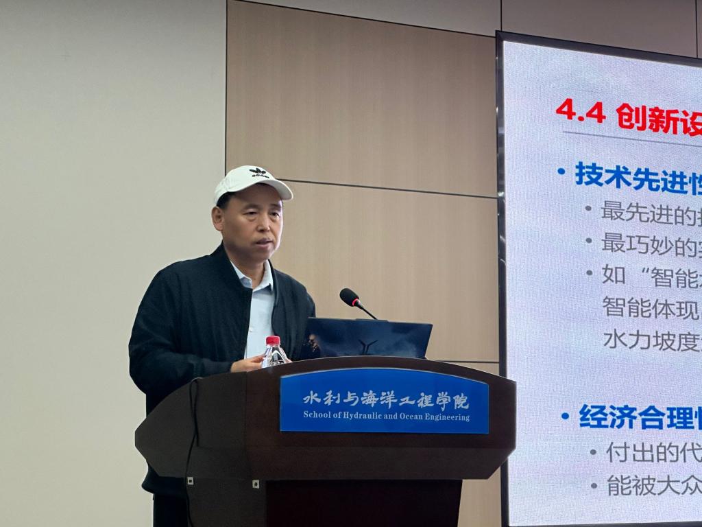 交流会上,程永光教授首先对全国大学生水利创新设计大赛的竞赛规则进行了解读,他重点围绕“选题策略”“团队构建”“技术路线设计”三大核心维度展开讲解,提出“需求导向-痛点挖掘-技术突破”的创新设计路径。他认为,好的创新设计作品应当具有创新性、重要性、可实现性、科学原理明确性、技术先进性或者实现的巧妙性、经济合理性等六大特征,既要体现创新价值,也要关注现实问题的解决方案落地。