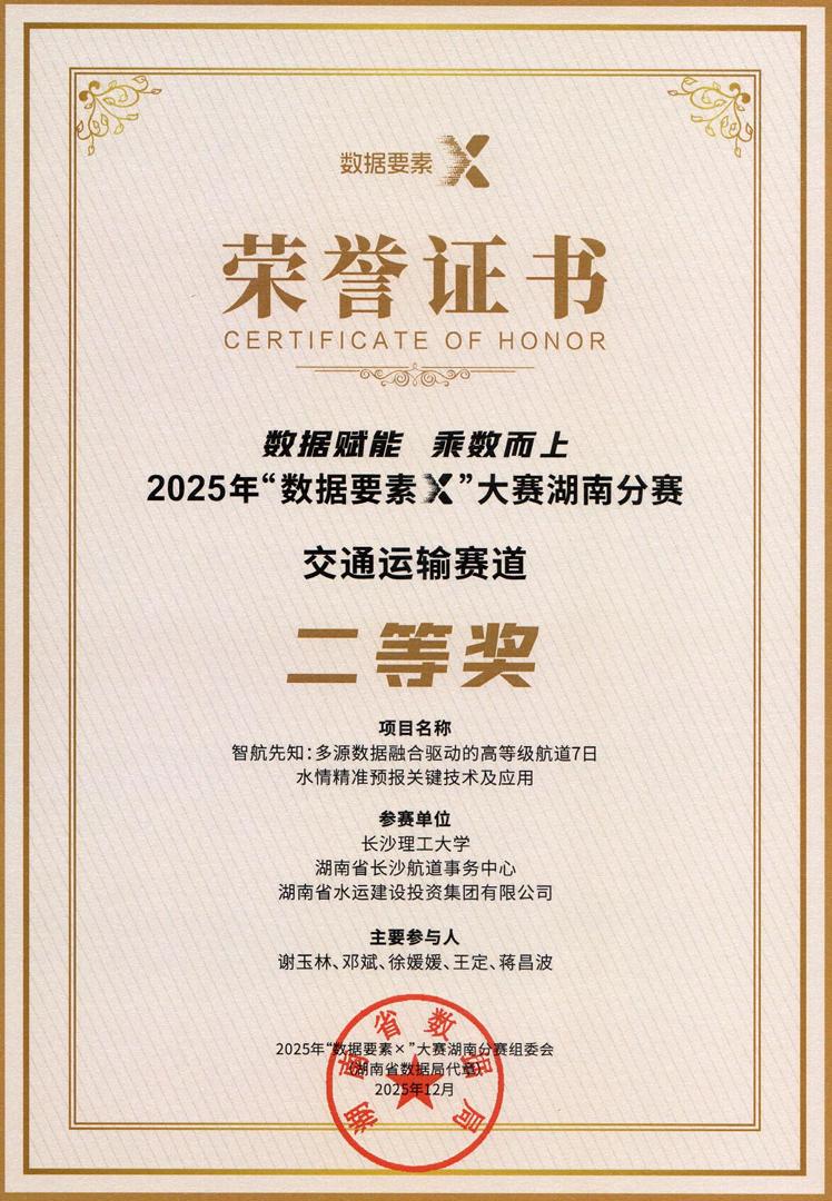 近日,由我院牵头联合长沙航道事务中心、湖南省水运建设投资集团有限公司申报的《智航先知:多源数据融合驱动的高等级航道7日水情精准预报关键技术及应用》项目,荣获2025年“数据要素×”大赛湖南分赛交通运输赛道二等奖。该项目依托省交通运输厅“揭榜挂帅”课题,通过整合湘江流域30年水文气象及地形测量数据,创新研发“气象-水文-水动力”多级串联智能模型,实现了重点航道未来7日水情的精准预报。技术指标显示,其预报准确率超80%,时效较传统方法延长5天,精度提升30%。目前,成果已在湘江一级航道示范应用,有效赋能航道主动维护与通航安全预警,标志着我院在“智慧水运”数据赋能领域取得重大突破。