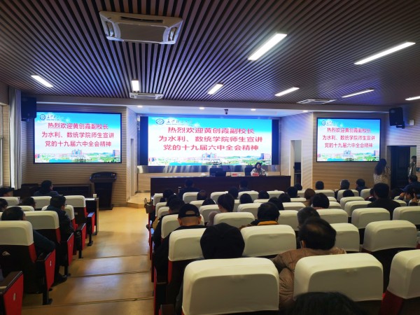 12月28日下午,长沙理工大学副校长黄创霞在理科楼A200为水利与环境工程学院、数学与统计学院教师宣讲党的十九届六中全会精神和湖南省第十二次党代会精神。水利学院党委书记喻玲娜主持会议。
