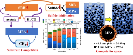 研究发现,整个实验过程中UASB反应器的COD去除率保持在90%以上,但由于硫酸盐还原菌(SRB)和产甲烷古菌(MPA)之间的复杂竞争,导致产气率下降了52%。污泥特性和微生物群落特征表明,SRB和MPA之间存在着复杂的竞争,包括对反应器内氢气和生存空间的竞争。此外,SRB对电子的竞争优势导致反应器中产生了更多的硫化物,进一步抑制了MPA的活性。因此,厌氧处理低COD/硫酸盐比味精废水的反应器内的复杂抑制机制包括硫化物毒性抑制、SRB和MPA对基质和空间的竞争等,这不仅导致了产气量的降低,还影响了微生物活性和谷氨酸的降解。