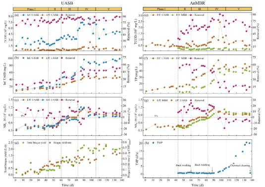 为解决现有猪粪废水处理过程中的经济和环境问题,联合升流式厌氧污泥床(UASB)和厌氧膜生物反应器(AnMBR),以阶梯性提高的实际猪粪废水作为进水,连续运行137天,以探究UASB-AnMBR组合工艺系统的污染物去除能力和微生物动态变化。