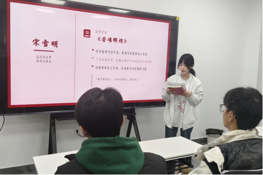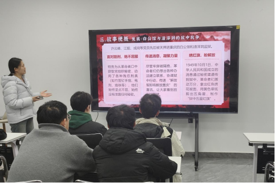 活动伊始,一段庄严肃穆的《红岩红》主题宣传短片缓缓播放,搭配激昂的主题曲旋律,镜头下革命先辈在狱中面对酷刑利诱坚贞不屈的身影、为信仰舍生取义的壮举,瞬间将现场氛围带入肃穆激昂的情境。同学们屏息凝视,直观感受到红岩精神的浩然正气与不朽力量,为整场分享会奠定了厚重的思想基调。