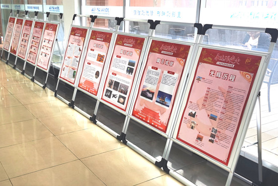 本次党史知识的展示主题为“永远跟党走”。宣传挂画从“光辉历程”、“红色精神”、“伟大思想”、“瞩目成就”四个部分展示了中国共产党的百年历程和伟大成就。