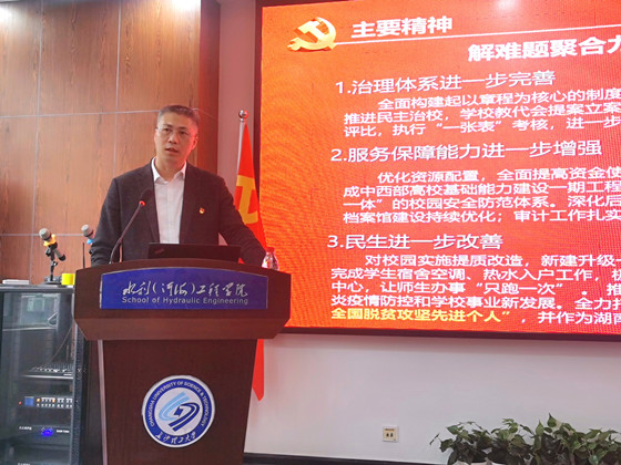 4月27日下午,校党委副书记蒋昌波在工三B319为水利工程学院全体教职工开展中国共产党长沙理工大学第四次代表大会精神宣讲。学院党委书记喻玲娜主持本次宣讲。