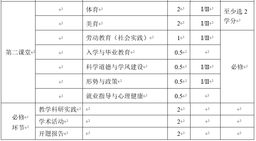 2.学生至少获得第二课堂5学分方可毕业。第二课堂活动学分认定见《长沙理工大学研究生第二课堂学分管理办法》。其中,体育和美育类课程一共2学分,劳动教育(社会实践)1学分,科学道德与学风建设0.5学分,形势与政策0.5学分,入学教育0.5学分,就业指导与心理健康0.5学分。