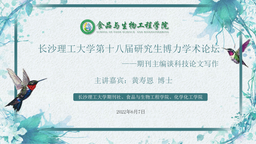 2020年6月7日晚,长沙理工大学期刊社、食品学院和化学学院在工三A320共同举办了长沙理工大学第十八届研究生博力学术论坛——“期刊主编谈科技论文写作”,此次论坛的主讲嘉宾系《食品与机械》杂志执行主编、中国食品科学技术学会食品装备与智能制造分会副理事长、湖南省食品科学技术学会副理事长黄寿恩博士,食品学院和化学学院100余名师生出席,食品学院副院长许宙主持本次讲座。